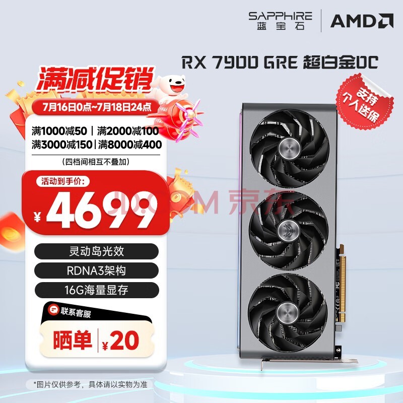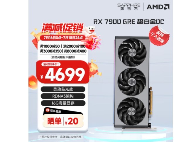 RX 7000系显卡是AMD本代最新产品,其中RX 7900 GRE定位中高端,可在2K分辨率下高帧率畅玩3A游戏。RX 7900 GRE刚发布时AMD的官方建议售价为5299元。目前蓝宝石 RX7900 GRE 16GB GDDR6 超白金 OC领券立减150元,只要4699元,晒单还有20元E卡领取。