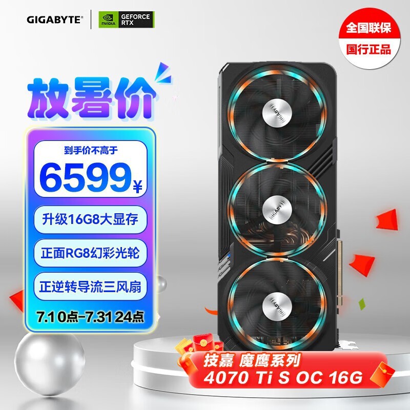 技嘉 RTX4070Ti SUPER Gaming OC 独立显卡现在售价6599元。但是我们有优惠活动,只需6269.05元即可入手。技嘉 RTX4070Ti SUPER显卡是中期小改款的产品,性能有所提升。核心部分是 AD103-275 GPU,拥有8448个 CUDA 内核,相较于RTX4070Ti提升768个流处理器,提升幅度约10%。基础频率2.61GHz,加速频率2.34GHz。此外,技嘉 RTX4070Ti SUPER显存升级至16GB GDDR6X,672GB/s显存带宽,256 bit显存位宽,L2缓存48MB。RGB炫彩光轮和强化金属背板也是它的亮点之一。如果你正在寻找一款性价比高的独立显卡,那么这款产品绝对值得你的关注和购买!