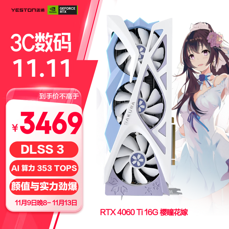 盈通 RTX4060Ti 16G D6 樱瞳花嫁 OC 全新架构 DLSS 3技术 直播视频电竞游戏AI光追显卡