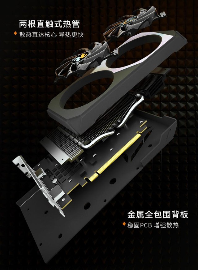 在散热方面,磐镭RX6500 XT 8GD6ARMOUR正面两个风扇,内部大面积散热鳍片加上两根直触式热管设计,使其拥有强大的散热性能。作为入门级显卡,金属背板依然也是少不了,底部搭载着全包围金属背板,印有“双蛇”超级符号和“BeyondThe Gamers”口号以及简约的三角形设计,辅助散热的同时也能加固PCB防止变形。