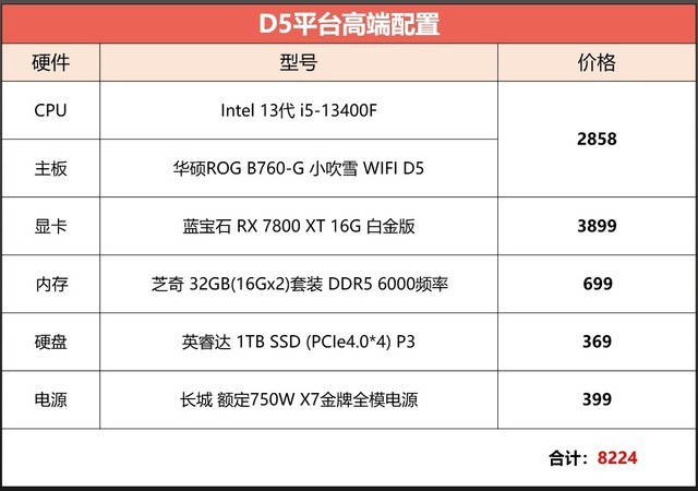 目前内存价格比较稳定,如果选择D5平台的话,需要注意容量尽量选择32G(16G*2),否则仅靠频率升级D5平台意义不大。