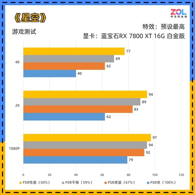 另外在FSR档位方面,《星空》并没有直接的模式选择,而是需要手动调整缩放倍率,我们一律按照标准的FSR质量(1.5倍)、FSR平衡(1.7倍)、FSR性能(2倍)进行测试。不过游戏中并没有50%以下的调节选项,所以33%的超级性能比例不测试。