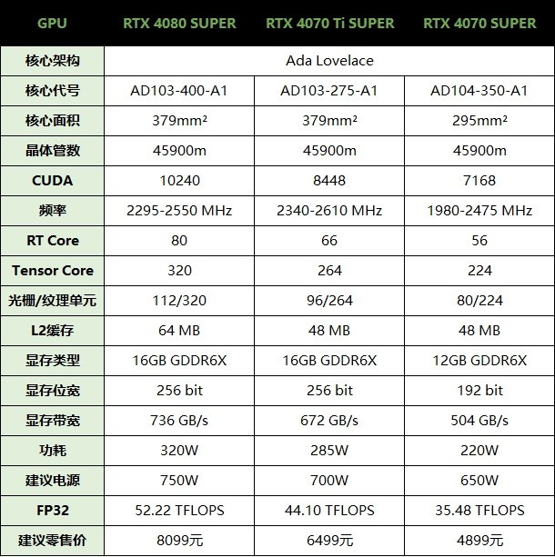 这类显卡都是旧型号的迭代升级,RTX 4070 SUPER和RTX 4070 Ti SUPER都是加量不加价,RTX 4080 更多的SUPER是加量降价。
