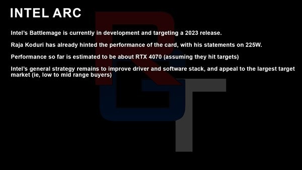 RTG声称,根据目前的估计,IntelArc第二代显卡的性能有望达到RTX4070的水平,但要看能否实现这一目标。毕竟,Arca系列最初预计会赶上RTX3070甚至RTX3070Ti,最终只能和RTX3060一样。当然,RTX4070预计要到明年二季度甚至年中才会发布,性能如何还不确定,预计基于A104核心,5888个CUDA核心,12GBGDDR6X显存,功耗250W。