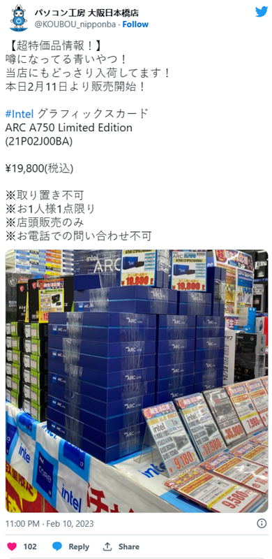 零售商有一些限制,包括没有预订,每人只卖一张卡,只在店里卖。对于日本游戏玩家来说,这是一个无与伦比的价格,ArcA750绝对应该以这个价格试用。销售已于2月11日(当地日本时间)开始。