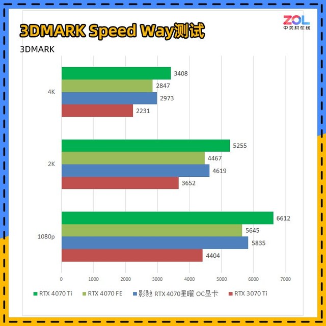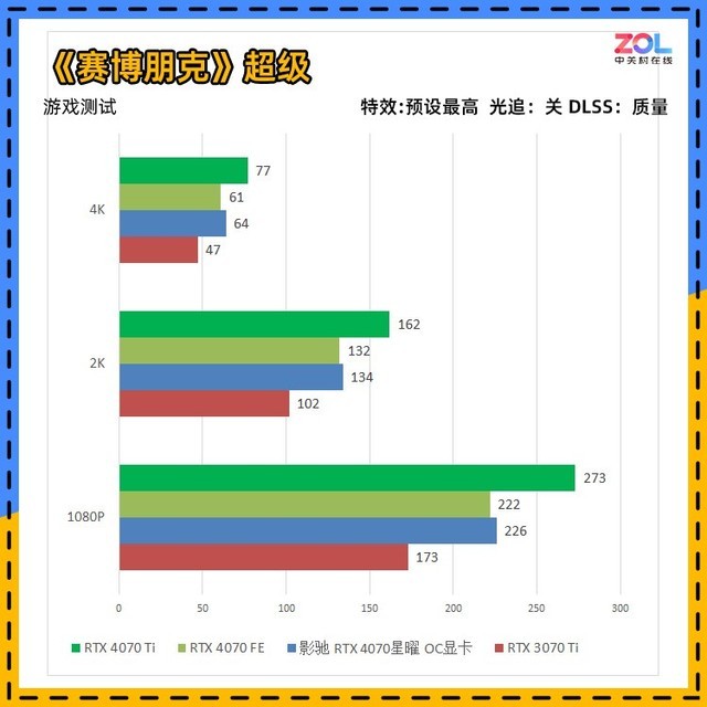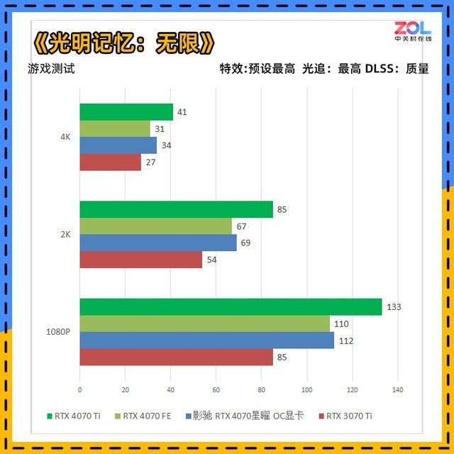 对比RTX3070Ti显卡,影驰 RTX4070 星曜 OC显卡从1080p分辨率到4K提升依次为28%/22%/28%。