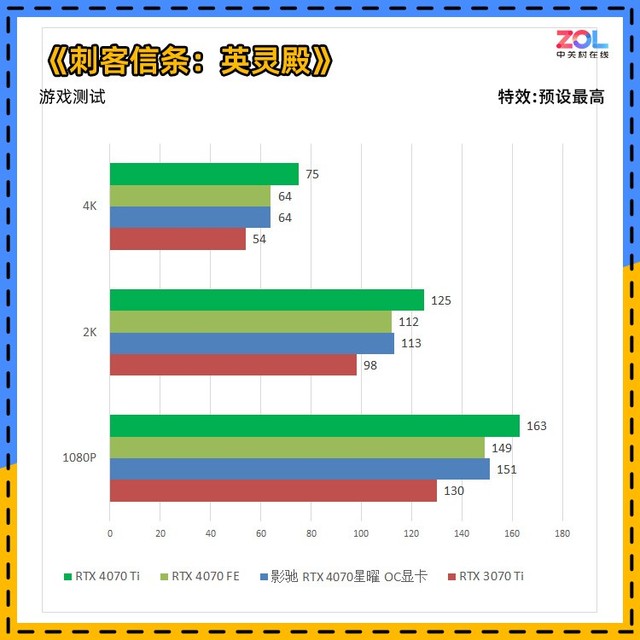 游戏测试中,这几款游戏整体帧数表现趋势基本都一样,RTX4070远超RTX3070Ti,而每款游戏,影驰 RTX4070 星曜 OC显卡的帧数表现也都要比公版显卡强几帧,提频对于游戏帧数的提升确实很有帮助。