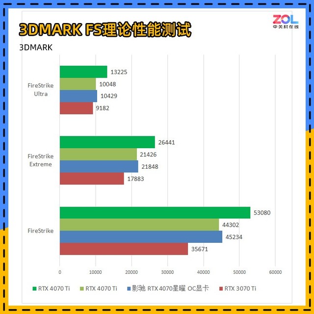 而对比刚刚发布的RTX4070Ti,光追测试综合成绩相差19%左右,不过相较于公版,影驰 RTX4070 星曜 OC显卡提升3%。