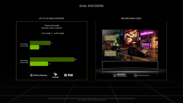 这得益于RTX40系采用全新的双编码器,可实现协同工作,通过自动分配来达成双路输出,在GeForceRTX 40系列GPU的助力下,视频制作获得了显著提升,采用GeForceRTX 40系列的全新双编码器,等待视频导出的时间缩短将近一半。