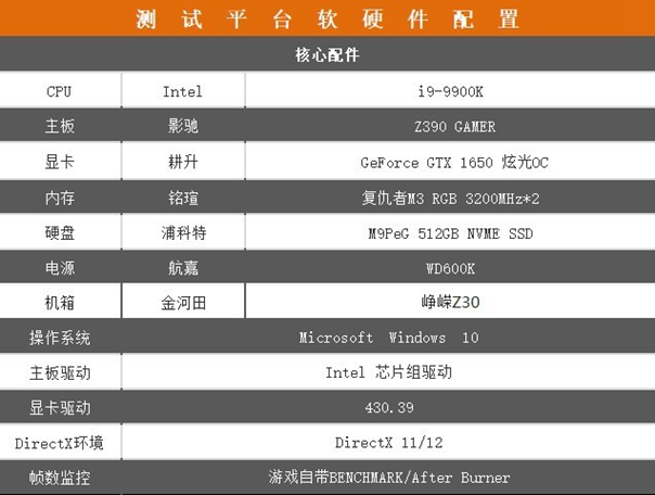 测试平台方面,采用第九代Intel八核心十六线程的i9-9900K、影驰Z390 GAMER主板、浦科特M9PeG 512GB NVME SSD、超频3 超神 3200MHz 8G*2、显示器为戴尔U2718Q、电源为航嘉 WD600K、机箱为金河田峥嵘Z30。详情请看上图。