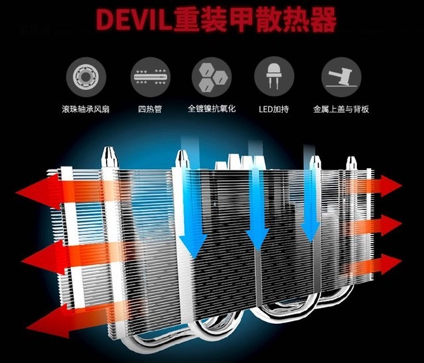 除却性能外,迪兰 RX590 8G V2采用的Devil重装甲散热器也颇值得称道。双滚珠轴承风扇设计,使用寿命长,大尺寸扇叶加强风压,四根热管经过镀镍抗氧化特别处理,并且搭配大面积的镀镍鳍片,可高效将鳍片上的热量吹走。经过测试,在室温30℃下满载温度只有75℃。