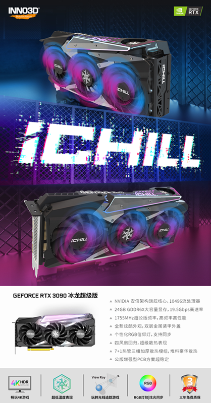 映众 RTX3090冰龙超级版的外形与自家的RTX3080冰龙超级版如出一辙,整体配色采用暗金色与深灰色调,全金属的外壳包裹散热器,相当拥有质感,而3+1风扇的超壕配置非常引人入胜。