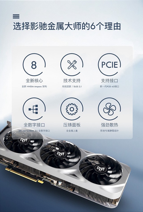 影驰 RTX3070Ti金属大师MAX OC[FG]采用NVIDIA AMPERE架构,拥有强力的性能,适合使用2K分辨率的游戏玩家,配合NVIDIA DLSS技术,也能在4K分辨率下提供丝滑的游戏画面,并且RTX显卡支持开启光线追踪技术,能为玩家提供更为现实的场景,加上影驰金属大师系列显卡的外观质感,无论是性能还是外观都是一种享受,所以带上这张影驰 RTX3070Ti金属大师MAX OC[FG]显卡,去当上艾尔登之王吧!