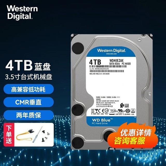 西部数据 蓝盘4TB 3.5英寸台式电脑机械硬盘 CMR垂直256M缓存 SATA3.0接口 4T(WD40EZAX)CMR垂直
