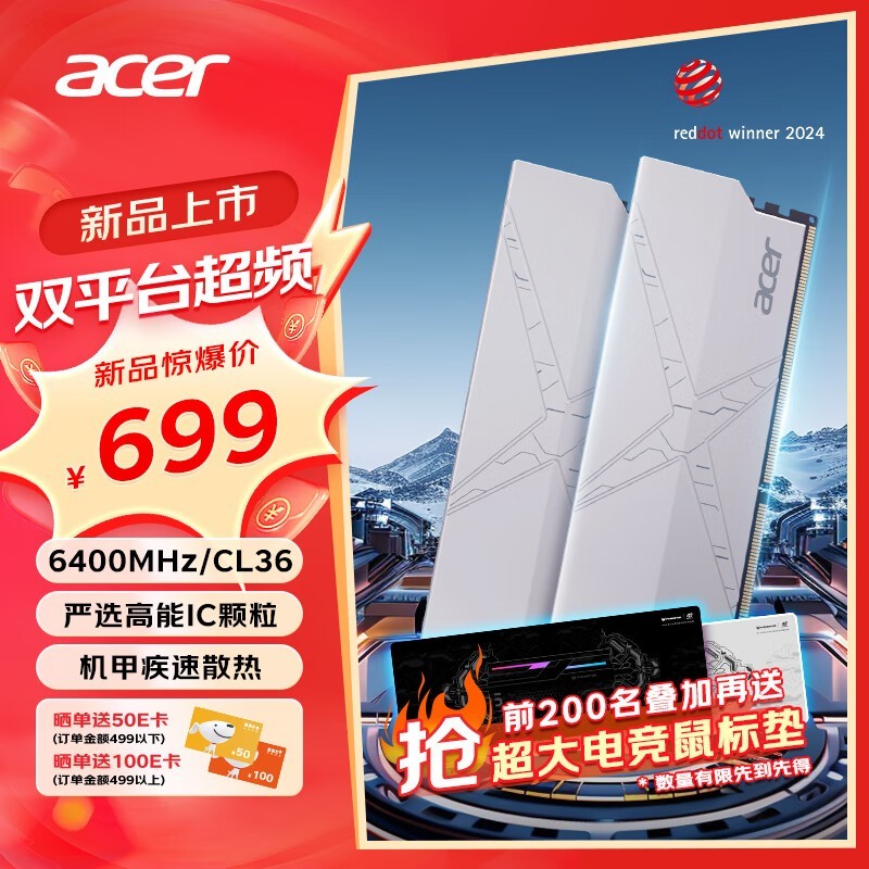 宏基 32G DDR5 6400频率 台式机内存条 HT200系列(C36) 炫光银 AI电脑配件