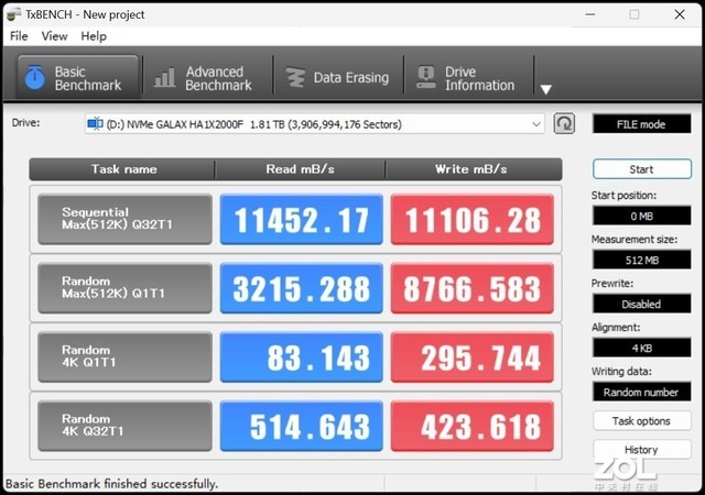 在用于对比的TxBENCH中,影驰名人堂HOF EXTREME 50S 2TB最高顺序读写速度为11452.17MB/s和11106.28MB/s。