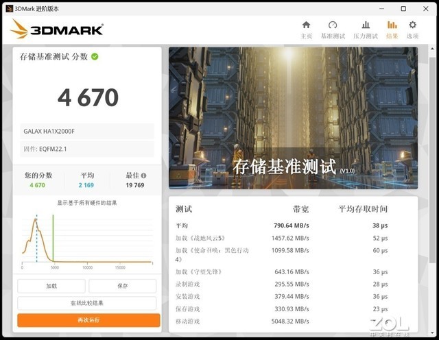 最后是3DMARK的存储DLC测试,最终影驰名人堂HOF EXTREME 502TB固态硬盘的存储基准测试得分高达4670分,平均带宽为790.64MB/s,平均存取时间低至38us。这两项测试均表明,影驰名人堂HOF EXTREME 50 2TB相对于HOF EXTREME 50 2TB进步明显,成为市面上速度最快的PCIe5.0产品之一。