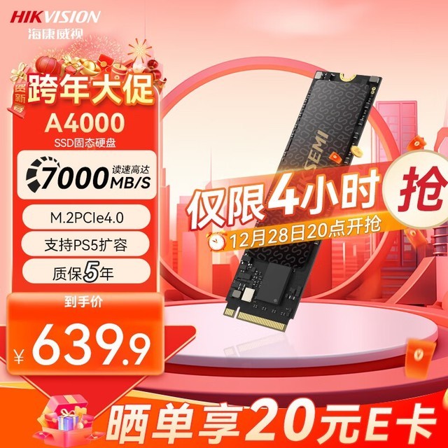 海康威视 A4000系列NVMe M.2固态硬盘2TB(PCI-E4.0)现在有优惠活动,原价649元,现价639元。海康威视 A4000固态硬盘采用定制主控和自研固件,功耗低且性能出色。其最大顺序读取速度高达7100MB/s,最大顺序写入速度高达6350MB/s,并且具有出色的随机4K读取和写入速度。此外,海康威视 A4000的最大功耗仅为4.9W,可实现长达1500TB的TBW寿命。使用DRAMless架构和新一代石墨烯铜箔散热贴片,使其在性能和散热方面都表现出色。如果你正在寻找一款高性价比的固态硬盘,那么这款产品值得你的关注!