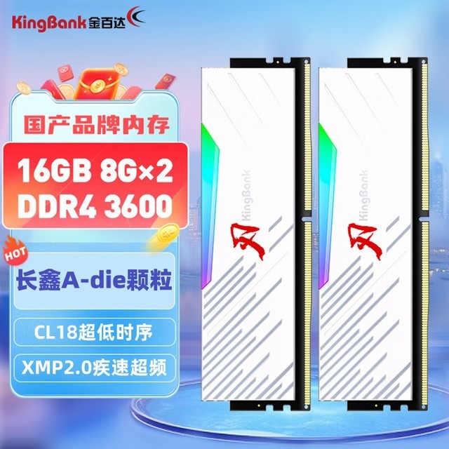 金百达 16GB DDR4 3600 台式机内存条长鑫A-die颗粒RGB灯条刃系列 C18