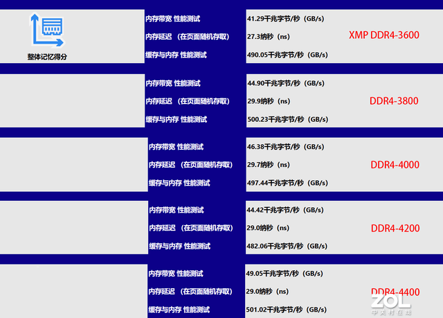 在高级测试软件Sissandra的内存测试中,在XMP DDR4-3600模式下,内存带宽为41.29GB/s,延迟27.3ns;超频到最高DDR4-4400模式,带宽达到49.05GB/s,延迟为29ns。