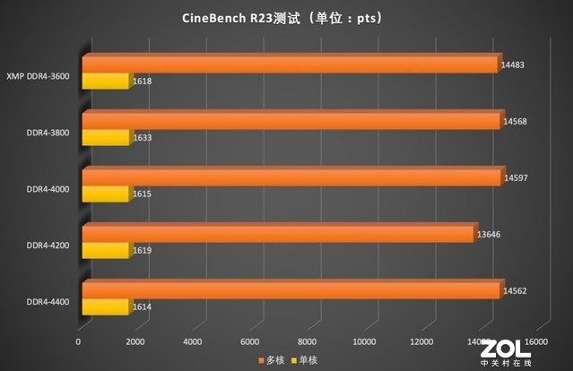 最后是CinebenchR23的测试,通过单线程和多线程的渲染场景来显示内存频率增加对CPU性能的影响。在DDR4-3600模式下,单核得分为1618pts,多核得分为1483pts;最低点出现在DDR4-4200模式,单核得分为1619pts,多核得分仅为13646pts;