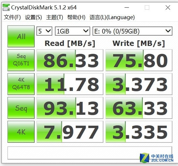 在CrystalDiskMark测试中,惠普 MX310的最大连续读取速度为86.33MB/s,写入75.80MB/s这样的成绩表现在同价位SD卡来说相当不错,达到了主流水准。