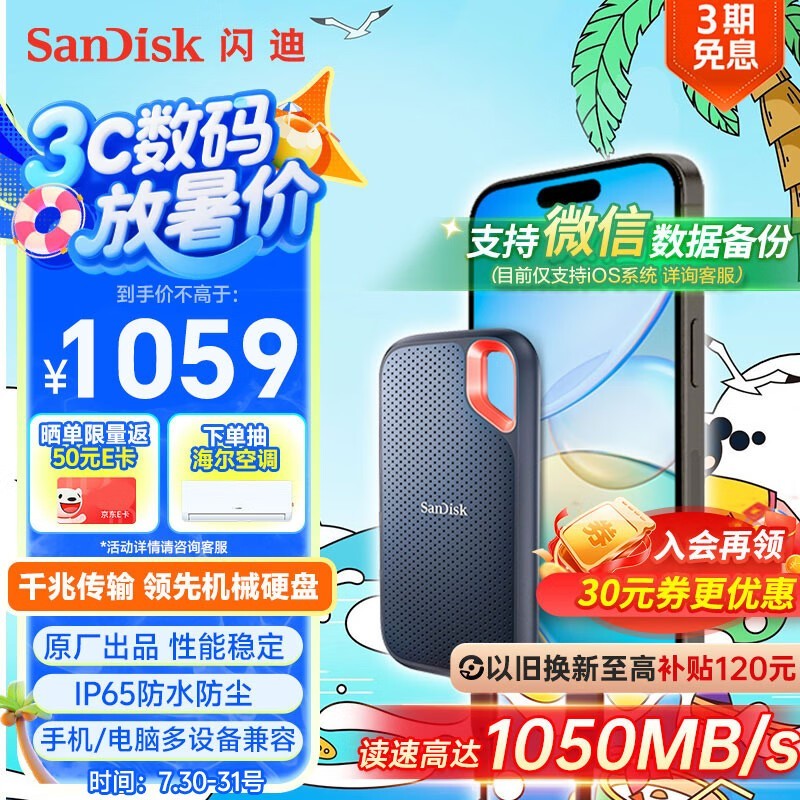 闪迪 E60 USB3.1 移动固态硬盘 Type-C 2TB 黑色,京东售价 1059 元,现在可领取 30 元优惠券,晒单再返 50 元 E 卡,最终到手价仅需 979 元,性价比大幅提升,值得入手。闪迪 E60硬盘采用坚固耐用的铝合金外壳设计,具备 IP55 等级防护,可轻松应对户外复杂环境,同时支持 2 米抗摔,耐用性更强。内置 NVMe 高速技术,传输速度高达 1050MB/秒,搭配 USB3.1 Gen2 接口,配备 USB-C 与 USB-A 双接口,轻松实现设备间快速传输,2TB 大容量满足工作与娱乐的多重需求,是高效人士的理想存储选择。