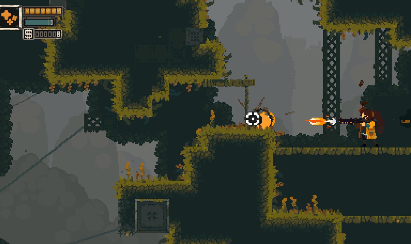 无论是平台跳跃还是BOSS战,《Rusted Moss》的难度都非常高。这种难度主要来源于游戏的核心机制——橡皮绳的高灵敏度操作需求,以及高复杂度的弹幕模式。