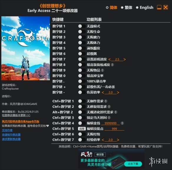 《创世理想乡》的二十一项修改器风灵月影版是一个为这款融合了众多创造类要素的游戏打造的修改工具。