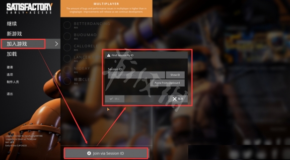 4、联机的好友在游戏主界面中点击加入游戏后选择join via Session ID
