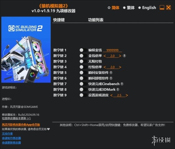 《装机模拟器2》v1.9.19九项修改器风灵月影版是一款针对该游戏设计的辅助工具,提供了九项强大的修改功能。这些功能包括无限金钱、快速建造、解锁所有零件等。