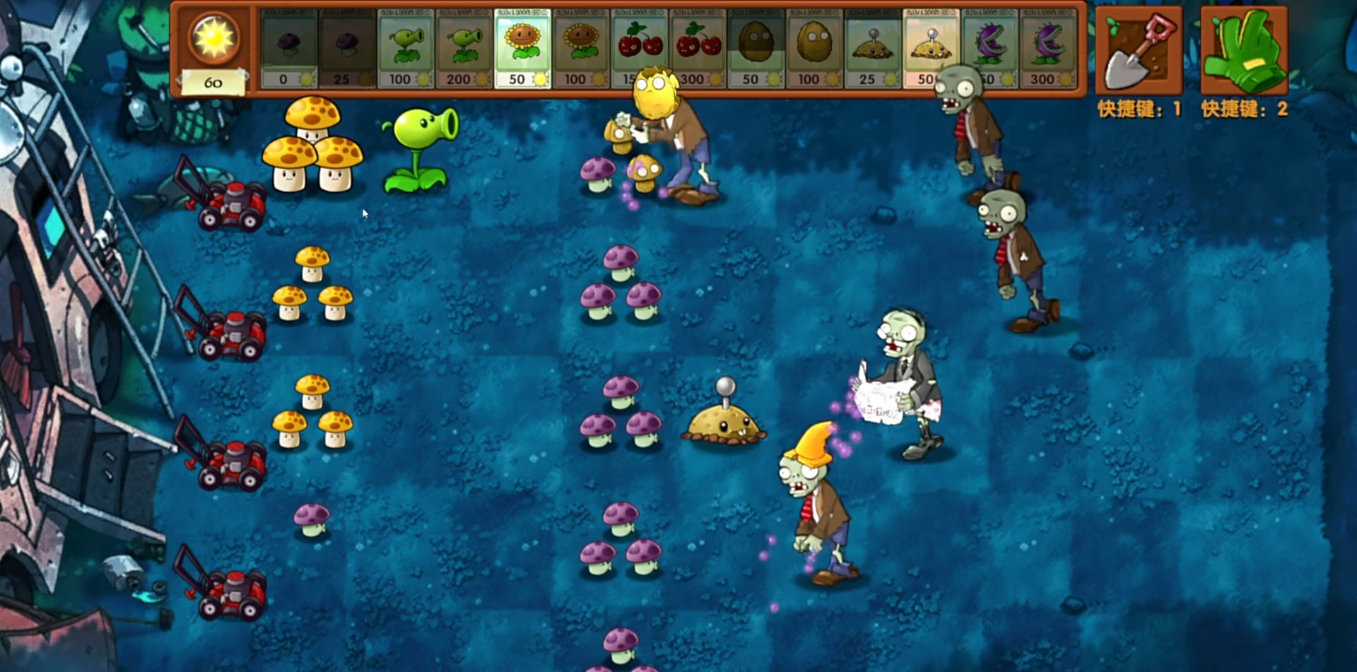 2、新增基础植物:小喷菇、大喷菇、魅惑菇、胆小菇、寒冰菇、毁灭菇