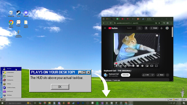 游戏采用了经典的Windows 98视觉效果,包括蓝色背景、开始菜单、任务栏等元素,营造出浓厚的复古氛围。