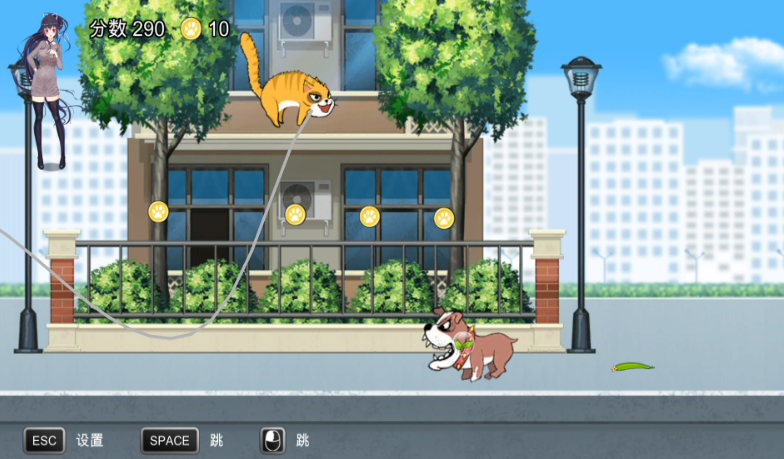 玩家通过点击鼠标左键或空格键控制喵星人跳跃,躲避街道上的固定障碍物,无法直接撞过固定障碍物,需灵活操作。