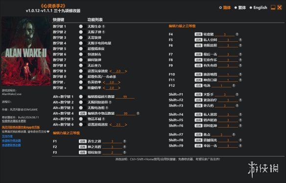 专为动作游戏《心灵杀手2》设计,提供了多种修改功能,帮助玩家更轻松地应对游戏中的挑战,极大地提升了游戏的可玩性和便利性。