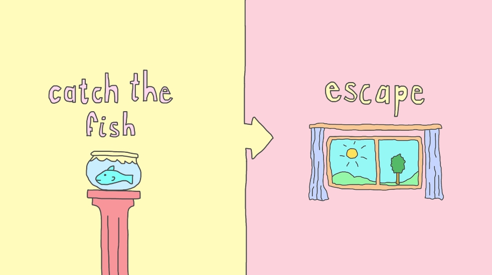 当抓到小鱼的时候大猫咪就会出现,小心躲避大猫咪的追捕并逃离房间
