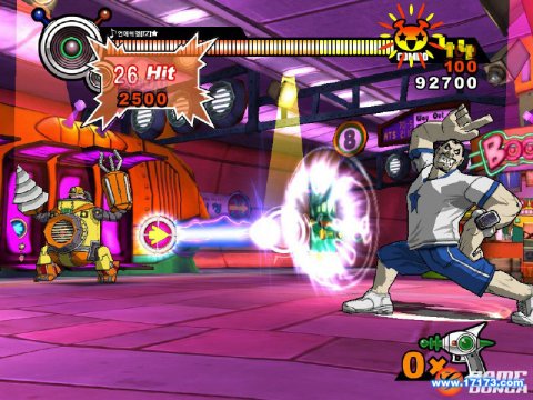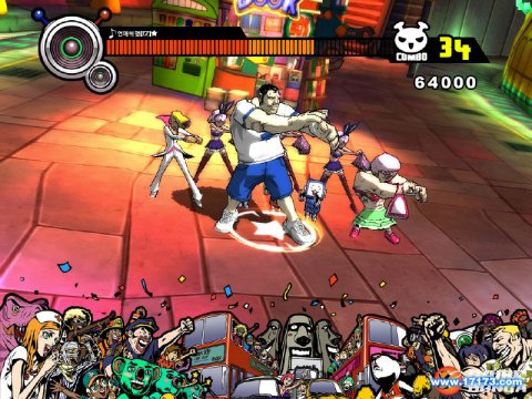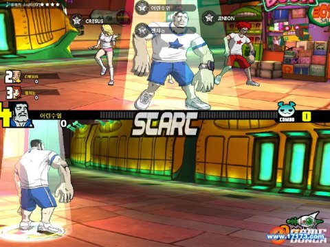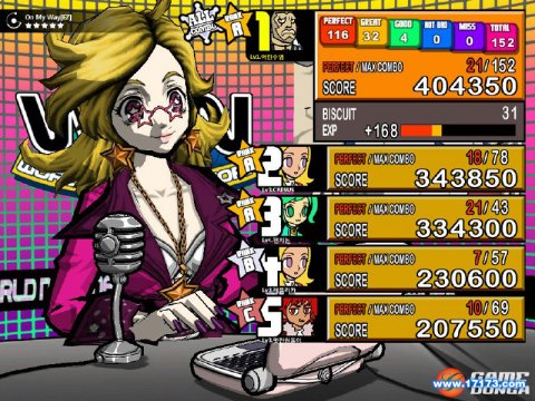虽然游戏里玩家也得跟着音乐按动键盘,但独特之处在于画面分成上下两部分,上部为跳舞的角色,下部为闪过的靶。玩家按对下面靶所对应的键盘,上面的角色就会跟着起舞。游戏目前具有单人模式和对战模式。
