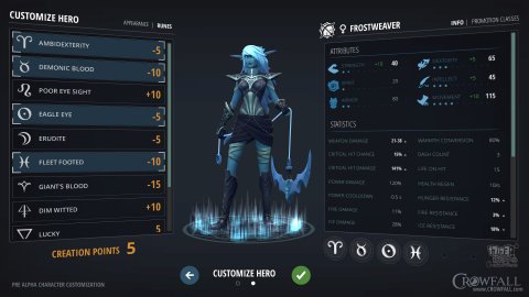 《鸦陨》是一个剑与魔法并存的世界,旨在带给已经陈腐的网游开发领域新鲜的血液。游戏有六个主属性,除了我们熟悉的力量、敏捷、智力和精神外,还有护甲和移动属性。综合属性包括火抗和冰抗,而且很有趣的还有个耐饿属性等