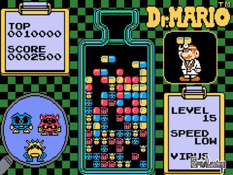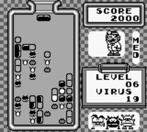 Players can select the degree of starting difficulty any time a new game is started. The initial level chosen is a value between zero and twenty that determines the number of viruses to clear, and the three game speed options change how fast the capsules fall in the bottle. The player's score is based solely on the elimination of viruses, not on the time taken to complete the level or the number of capsules used. If players complete the highest difficulty level, they can continue playing to accumulate a higher score, but the number of viruses to clear remains the same. Additional points are awarded when multiple viruses are eliminated at once, but no additional points are awarded for initiating chain reactions, in which the elimination of one set of objects triggers the elimination of another set. The game speed is also a factor in how the game calculates scoring; higher speed levels yield more points.