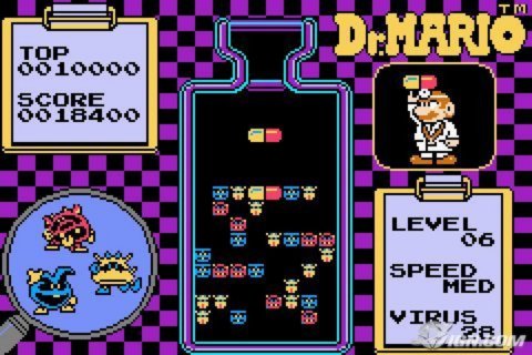 视频(0) 图集(1)游戏简介Dr. Mario is a falling block tile-matching video game,[13] in which Mario assumes the role of a doctor, dropping two-colored medical capsules into a medicine bottle representing the playing field. This area is populated by viruses of three colors: red, yellow, and blue. In a manner and style considered similar to Tetris,[14] the player manipulates each capsule as it falls, moving it left or right and rotating it such that it is positioned alongside the viruses and any existing capsules. When four or more capsule halves or viruses of matching color are aligned in vertical or horizontal configurations, they are removed from play. The main objective is to complete levels, which is accomplished by eliminating all viruses from the playing field. A game over occurs if capsules fill up the playing field in a way that obstructs the bottle's narrow neck.[15]