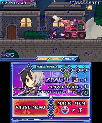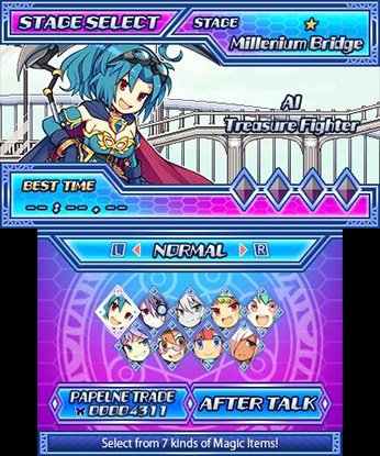 When you start the game you'll play through the Opening Stage. Upon clearing that, you'll move on to the Stage Select Screen where you have 8 stages to choose from. The Syega Fragments and Tres collected during stages can be used to Power Up the player character. After defeating a certain number of enemies in a stage, or reaching certain places you'll receive Syega Fragments which can be used to activate slots temporarily.