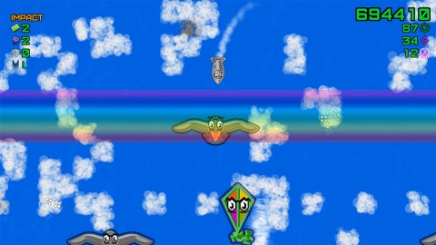 Every game is different because powerups alter your size, weight, health, score, damage output (of your nose bash) and drag factor, or they enable one of your special features. As well as every part of the sky being procedurally generated, there are also three optional Augments that are randomly assigned before a game that adjust a range of stats and enable very special features, drastically affecting gameplay experience.