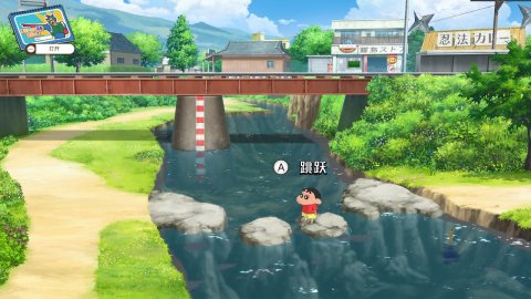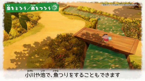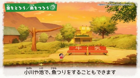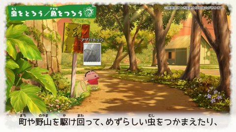 在本作中,玩家将扮演主角野原新之助(蜡笔小新),前往一个怀旧而又平凡的日本小镇,并在这里度过自己的暑假。场景内容丰富,除了钓鱼、捉虫、浇花等活动外,玩家还能与小镇中其他居民交谈以获得额外的任务或活动项目。