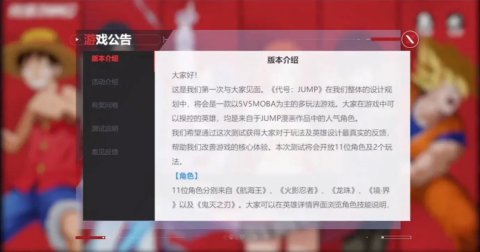 一款以5V5MOBA为主的多玩法游戏。游戏中可以操控的英雄,均来自于JUMP漫画作品中的人气角色,如《航海王》、《火影忍者》、《龙珠》、《境·界》以及《鬼灭之刃》,包括祢豆子、路飞、乔巴、宇智波佐助这些动漫热门角色,每位角色都有专属的潜能培养系统。两个玩法中除常规5V5 MOBA竞技外,还开放了3V3V3的「龙珠争夺战」。