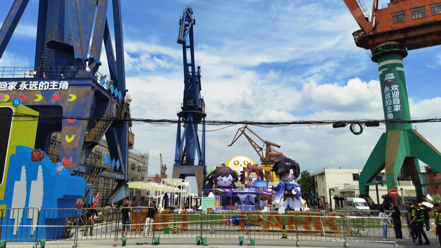 在船台公园区域,高大的塔吊、斑驳的厂房巍峨依旧;巨型充气玩偶、动漫海报标语点缀其间,让百年船厂的工业遗存宛如焕发新生。