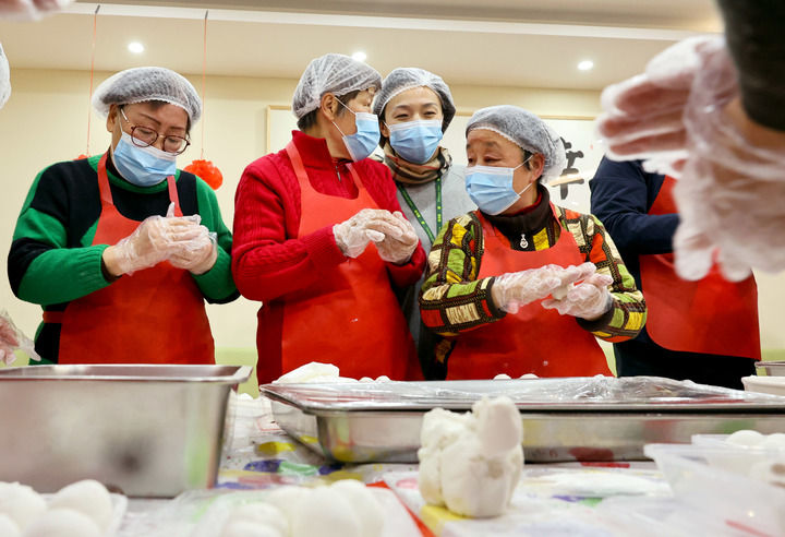2月12日,社区居民在黄浦区老西门街道“厢遇85”社区长者食堂包汤圆,迎接元宵节。新华社记者 方喆 摄