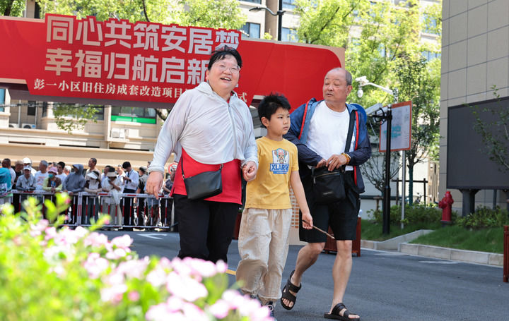 6月29日,首批领取新房钥匙的居民们走进彭一小区。新华社记者 方喆 摄
