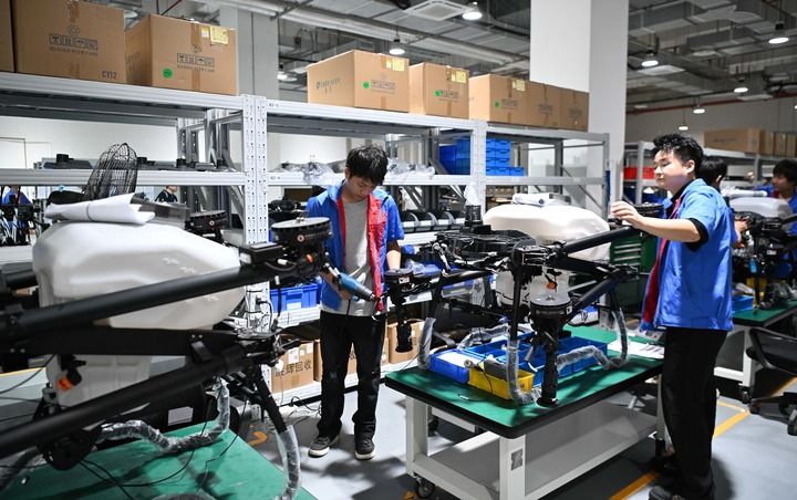 2025年6月26日,工作人员在联合飞机集团深圳基地的车间内组装植保无人机。新华社记者 邓华 摄