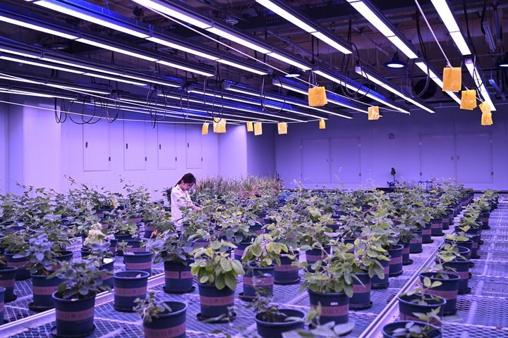 2025年7月6日,研究人员在位于安徽宿州的黄淮海(宿州)种业科技谷南京农业大学大豆生物育种中心人工气候室查看大豆长势。新华社记者 黄博涵 摄