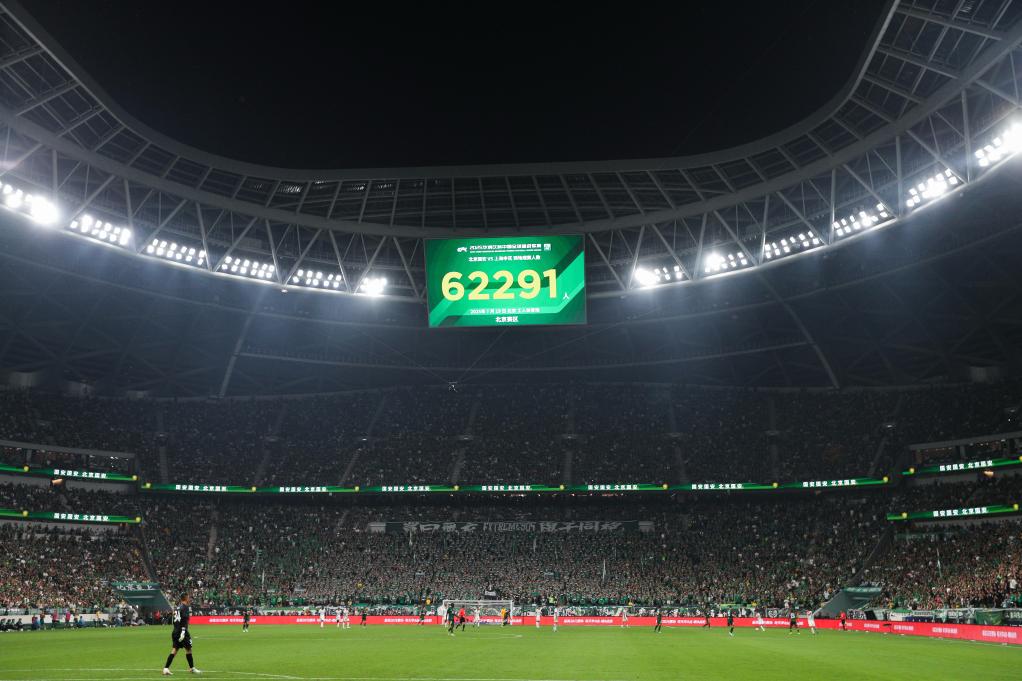 7月19日,球场大屏显示本场比赛共有62291名观众到场观赛,打破了自2023年北京工人体育场改造复建项目完成后的上座率纪录。新华社发(那宇奇摄)